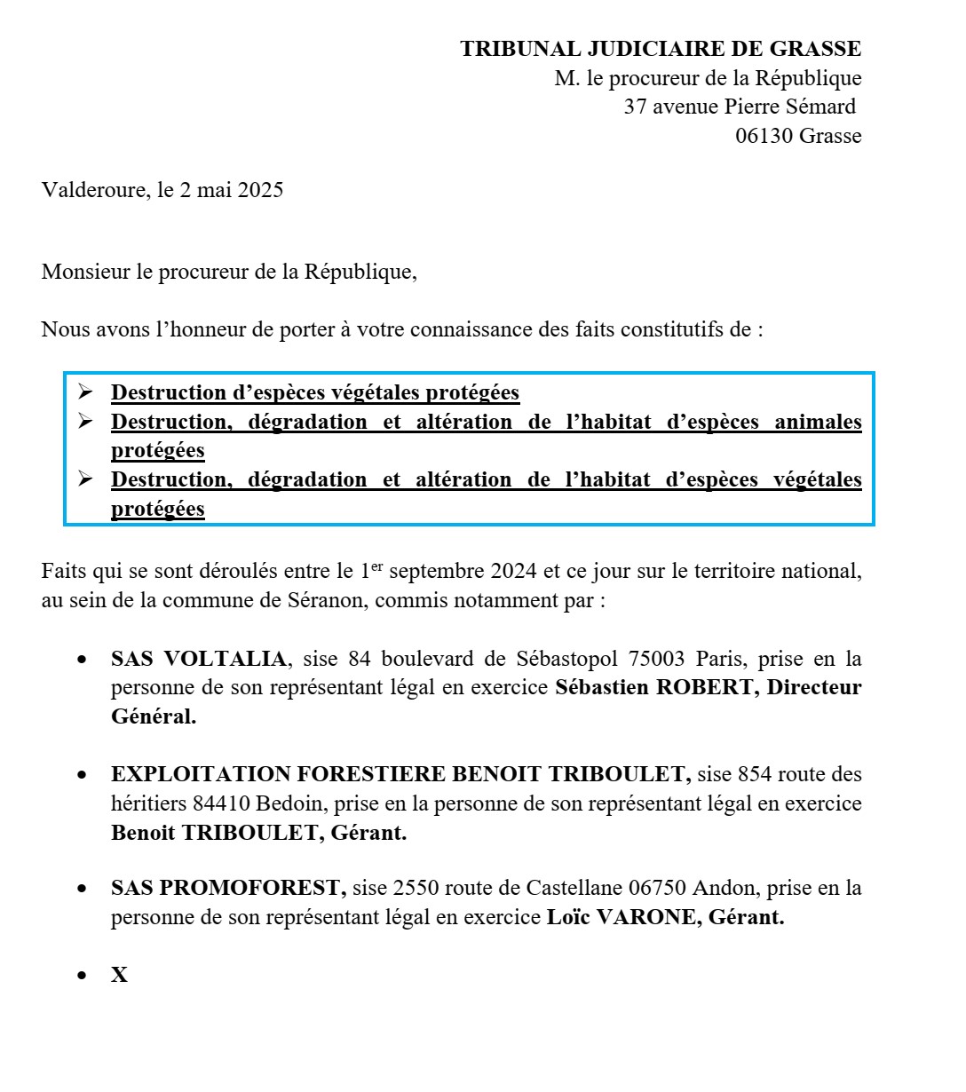 Janvier : Notification de la demande préalable au préfet des Alpes Maritimes dans le cadre du dossier de Séranon.