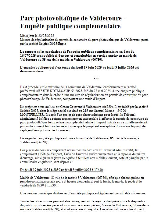Publication sur le registre officiel de l’enquête publique portant sur la régularisation du permis de construire de la centrale photovoltaïque de Valderoure. (Voir ci-dessous les 483 observations du public)